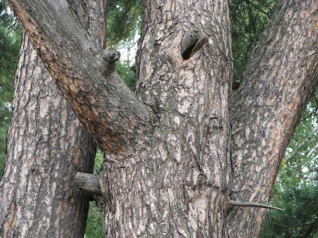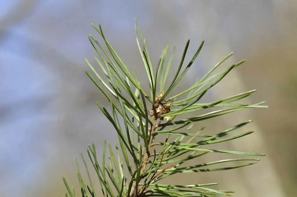 This tree has evergreen needles, which are rigid and arranged in pairs, each 3-8cm long, often twisted.